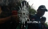 Kondisi kaca yang telah ditembusi peluru usai uji balistik senjata api Glock 17 di lapangan tembak Mako Brimob, Kelapa Dua, Depok, Jawa Barat, Selasa (23/10). (FOTO : Republika/Putra M. Akbar)