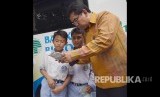 Direktur Kepatuhan, Manajemen Risiko dan SDI Bank Syariah Bukopin (BSB) Adil Syahputra (kanan) dan Deputi Direktur Edukasi OJK Jalius (kiri) menjelaskan produk tabungan SimPel iB dengan para siswa SDIT Harum, Jakarta, Selasa (23/10). BSB bersama dengan OJK menyelenggarakan edukasi keuangan bertema 'BSB dan OJK Goes to School:SimPel iB Week'. (FOTO : Prayogi/Republika)