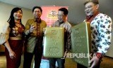 Dirut Bank Mega Kostaman Thayib (kedua kiri) didampingi Direktur Funding & Sales Distribution Diza Larentie (kiri), secara simbolis menyerahkan emas seberat masing-masing 1/2kg kepada Soediarto Soerjoprahono (kedua kanan) dan Iwan Haryono, sebagai pemenang utama program Mega Super Vaganza Gemilang Emas, di Jakarta, Selasa (23/10) (FOTO : Audy Alwi/Antara)