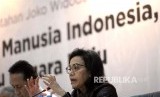 Menteri Keuangan Sri Mulyani (kanan) memberikan paparan saat capaian 4 Tahun Kinerja Pemerintahan Jokowi pada Forum Merdeka Barat (FMB) 9 di Gedung Kementerian Sekretariat Negara, Jakarta, Selasa (23/10). Sejumlah menteri memaparkan pencapaian kinerja selama empat tahun pemerintahan. (FOTO : Wihdan Hidayat/Republika)