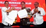Vice President Corporate Account Management Telkomsel Primadi K Putra (kiri) dan Direktur Human Capital PT Sumber Alfaria Trijaya Tri Wasono Sunu (tengah), menunjukkan naskah kerjasama yang telah ditandatangani, disaksikan Vice President Sales & Marketing Area Jabotabek Jabar Telkomsel Agus Mulyadi (kanan), di Jakarta, Selasa (23/10/2018). Kedua pihak bekerjasama dalam bentuk layanan Smart Voice Communication (SVC), Mobile Virtual Private Network (MVPN) dan Compact Enterprise (FOTO : Audy Alwi/Antara)