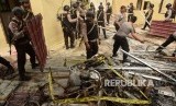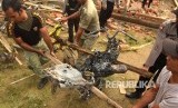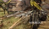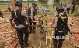 REPUBLIKA.CO.ID, ACEH TAMIANG -- Personel kepolisian membersihkan puing bangunan dan kendaraan dinas yang dibakar oleh massa di Mapolsek Bendahara, Aceh Tamiang, Aceh, Rabu (24/10).