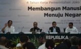 (dari kiri) Menteri Agraria dan Tata Ruang Sofyan Djalil, Menteri Perhubungan Budi Karya Sumadi, Menteri ESDM Ignasius Jonan dan Kepala Staf Presiden Moeldoko menjadi narasumber pada acara Diskusi Media FMB9 di gedung Kementerian Sekretariat Negara, Jakarta, Rabu (24/10/2018). (FOTO : Republika/Prayogi)