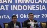 Direktur Keuangan BRI Haru Koesmahargyo (kanan) bersama Direktur Corporate Banking Kuswiyoto memberikan pemaparan keuangan BRI di Jakarta, Rabu (24/10/2018). PT Bank Rakyat Indonesia (BRI) membukukan laba bersih sebesar Rp23,5 triliun pada kuartal III-2018 atau tumbuh 14,6 persen. (FOTO : Hafidz Mubarak/Antara)