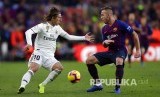 Luca Modric ditempel ketat Arthur pada laga Liga Spanyol antara Barcelona FC melawan Real Madrid di Camp Nou, Barcelona, Ahad (28/10). (FOTO : Joan Monfort/AP)