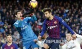 Thibaut Courtois (kiri) menyergap bola dari tandukan Gerard Pique (kanan) pada laga Liga Spanyol antara Barcelona FC melawan Real Madrid di Camp Nou, Barcelona, Ahad (28/10). (FOTO : Joan Monfort/AP)