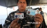 Awak KRI Kobra 867 Letnan Satu Fadhillah menunjukkan kartu identitas dari tas yang ditemukan di lokasi jatuhnya pesawat Lion Air JT 610 di perairan Laut Jawa, Senin (29/10) (FOTO : Mahmud Muhyidin)