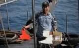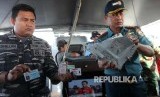 Dansatrol Lantamal III Jakarta, Kolonel Laut Salim (kanan) menunjukkan benda temuan di lokasi jatuhnya pesawat Lion Air JT 610 di perairan Laut Jawa, Senin (29/10) (FOTO : Mahmud Muhyidin)