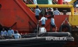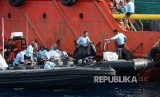Pasukan katak yang tergabung pada Tim SAR Gabungan memindahkan barang temuan dari lokasi diduga tempat jatuhnya Pesawat Lion Air JT 610 di perairan Laut Jawa. (FOTO : Mahmud Muhyidin)