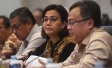 Menteri Keuangan Sri Mulyani (tengah) bersama Gubernur BI Perry Warjiyo (kiri) dan Menteri PPN/Kepala Bappenas Bambang Brodjonegoro (kanan) mengikuti rapat kerja dengan banggar DPR di Kompleks Parlemen, Senayan, Jakarta, Senin (15/10) (FOTO : antara/akbar)