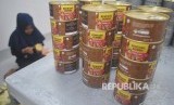 Pekerja memasang label pada kemasan kaleng rendang domba di Mitra Tani (MT) Farm, Tegalwaru, Ciampea, Kabupaten Bogor, Jawa Barat, Selasa (30/10/18). Produksi rendang domba sebanyak 1.600 kaleng yang dipesan salah satu bank BUMN dengan harga Rp35 ribu per kaleng. (FOTO : Arif Firmansyah/Antara)