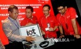 Vice President Corporate Account Management Telkomsel Primadi K Putra (kedua kanan), Vice President Internet of Things Adiwinahyu B Sigit (kedua kiri) dan Team Leader LOB (Line of Business) Utilities, Energy & Mining Services Reyhan (kanan), mendengarkan penjelasan Senior Manager Distribusi PLN UID Jakarta Raya Faisol, usai Penandatanganan Perjanjian Kerja Sama Layanan Smart Meter Berbasis NB-IOT, di Jakarta, Selasa (30/10) (FOTO : Audy Alwi/Antara)
