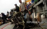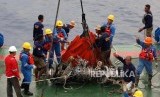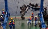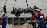 REPUBLIKA.CO.ID, KARAWANG -- Tim SAR Gabungan mengangkat bagian turbin mesin pesawat Lion Air PQ LQP Nomor Penerbangan JT 610 di perairan Karawang Sabtu (3/11). Bagian mesin pesawat diangkat Kapal Baruna Jaya 1 kemudian dipindahkan ke kapal landing craft utility (LCU) TNI AL.