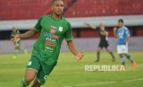Pesepak bola PSMS Medan Felipe Dos Santos Martins berekspresi setelah berhasil membobol gawang Persib Bandung dalam pertandingan Sepak Bola Liga 1 di Stadion I Wayan Dipta, Gianyar, Bali, Jumat (9/11/2018). (FOTO : Antara/Nyoman Budhiana)