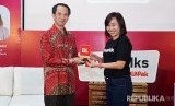 Chief Financial Officer Bukalapak Natalia Firmansyah memberikan cinderamata Plt. Deputi Bidang Koordinasi Perlindungan Perempuan dan Anak Ghafur Dharmaputra Kemenko PMK di Jakarta, Sabtu (10/11). Bukalapak menggelar Festival Srikandi Nusantara sebagai bentuk dukungan Bukalapak bagi pemberdayaan perempuan. (FOTO : Dok Bukalapak)
