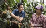 Karyawan mikro Bank Mandiri mengunjungi debitur KUR petani kopi di perkebunan kopi di Cimaung, Gunung Puntang, Kabupaten Bandung, Jawa Barat, Sabtu (10/11). Bank Mandiri terus memajukan ekonomi kerakyatan melalui penyaluran KUR sektor produksi. (FOTO : M Agung Rajasa/Antara)