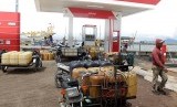 Nelayan menunggu pasokan solar di SPBN Pelabuhan Lampulo, Banda Aceh, Aceh, Sabtu (10/11). Sejumlah nelayan setempat menyatakan kesulitan memperoleh bahan bakar solar karena kuota pasokan solar di SPBN tersebut. (FOTO : Ampelsa/Antara)