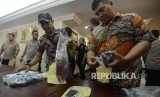 Sejumlah petugas kepolisian memperlihatkan sejumlah barang bukti saat konferensi pers di Polda Metro Jaya, Jakarta, Jumat (16/11). (FOTO : Republika/Putra M. Akbar)