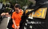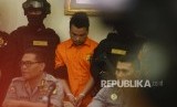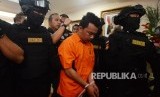 Tersangka kasus pembunuhan satu keluarga HS digiring usai konferensi pers di Polda Metro Jaya, Jakarta, Jumat (16/11). (FOTO : Republika/Putra M. Akbar)