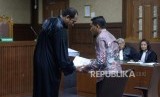 Bupati Bener Meriah nonaktif Ahmadi menerima berkas tuntutan saat menjalani sidang beragendakan tuntutan di Pengadilan Tindak Pidana Korupsi, Kamis (22/11). (FOTO : Republika/Iman Firmansyah)