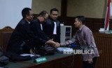 Bupati Bener Meriah nonaktif Ahmadi bersalaman dengan jaksa penuntut umum usai menjalani sidang beragendakan tuntutan di Pengadilan Tindak Pidana Korupsi, Kamis (22/11). (FOTO : Republika/Iman Firmansyah)