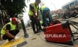 Sejumlah petugas Suku Dinas Bina Marga Jakarta Selatan saat memasang bollard di kawasan Mampang, Jakarta Selatan, Ahad (25/11). (FOTO : Republika/Putra M. Akbar)
