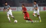 Gelandang Timnas Indonesia Riko Simanjuntak (tengah) dibayangi kedua Pesepakbola Filipina saat menggiring bola pada Pertandingan Grup B Piala AFF Suzuki Cup di Stadiun Gelora Bung Karno, Jakarta, Ahad (25/11). (FOTO : Republika/Mahmud Muhyidin)