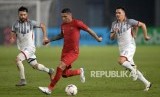 Penyerang Timna Indonesia Alberto Da Costa (tengah) dibayangi kedua Pesepakbola Filipina saat menggiring bola pada Pertandingan Grup B Piala AFF Suzuki Cup di Stadiun Gelora Bung Karno, Jakarta, Ahad (25/11). (FOTO : Republika/Mahmud Muhyidin)