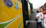 Petugas turun dari angkutan umum TransPatriot jurusan Terminal Bekasi - Harapan Indah di Terminal Bekasi, Jawa Barat, Senin (26/11). (FOTO : Republika/Iman Firmansyah)