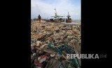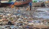 Nelayan menyandarkan perahunya di bibir pantai yang dipenuhi sampah plastik di Desa Dadap, Indramayu, Jawa Barat, Senin (26/11/2018). LSM World Wild Fund for Nature (WWF) Indonesia menilai masalah pencemaran sampah plastik di laut Indonesia sangat parah. (FOTO : Dedhez Anggara/Antara)