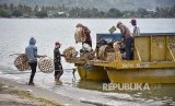 Sejumlah pekerja mengangkat sampah yang dibawa dari kawasan wisata Gili Meno dan Gili Air di Pantai Sire, Desa Sigarpenjalin, Tanjung, Lombok Utara, NTB, Senin (26/11) (FOTO : Ahmad Subaidi/Antara)