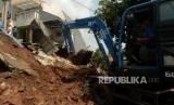 Sejumlah petugas saat membersihkan puing-puing bangunan akibat longsoran tanah yang menghancurkan satu rumah di Perumahan Pesona Kalisari, Pasar Rebo, Jakarta Timur, Selasa (27/11). (FOTO : Republika/Putra M. Akbar)