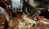 Sejumlah warga melihat longsoran tanah yang menghancurkan satu rumah di Perumahan Pesona Kalisari, Pasar Rebo, Jakarta Timur, Selasa (27/11). (FOTO : Republika/Putra M. Akbar)