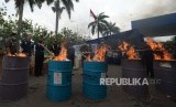 Kepala Bea Cukai Bekasi, Hatta Wardana (tengah) beserta perwakilan dari TNI, Polri, Pol PP memusnahkan rokok dengan dibakar dalam acara pemusnahan rokok dan minuman keras di halaman Bea Cukai Bekasi, Jawa Barat, Rabu (28/11). (FOTO : Republika/Iman Firmansyah)