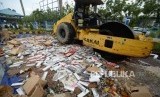 Alat berat menghancurkan rokok dan minuman keras di halaman kantor Bea Cukai Bekasi, Jawa Barat, Rabu (28/11). (FOTO : Republika/Iman Firmansyah)