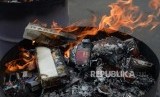 Rokok dibakar dalam acara pemusnahan rokok dan minuman keras di halaman Bea Cukai Bekasi, Jawa Barat, Rabu (28/11). (FOTO : Republika/Iman Firmansyah)