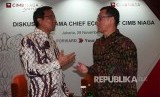 Chief Economist CIMB Niaga Adrian Panggabean (kiri) berbincang dengan Head of Marketing Brand and Communications CIMB Niaga Toni Darusman (kanan) disela acara Diskusi Media Bersama Chief Economist CIMB Niaga di Jakarta, Rabu (28/11). Pertumbuhan ekonomi pada 2019 diproyeksi tumbuh sebesar 4,9% atau sedikit lebih rendah dari rerata 2018. (FOTO : Darmawan/Republika)