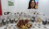 Seorang penjaga booth memperlihatkan bahan obat-obatan tradisional berupa tumbuh-tumbuhan pada acara Chexpo ASEAN 2018 di JIEXPO Kemayoran Jakarta, Kamis (29/11). Pameran yang akan berlangsung hingga 30 November mendatang ini menggelar berbagai peralatan medis dan obat-obatan tradisional dari China. (FOTO : Darmawan/Republika)