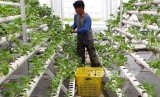 Seorang pekerja perkebunan sedang memanen sayur pokcay yang ditanam secara hidroponik dan organik di Pradipto Farm di kampung Cilegong desa Mekar Wangi kecamatan Cisauk, Tangerang, Banten, Sabtu (1/12). (FOTO : darmawan / Republika)