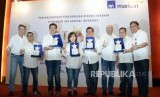 Presiden Direktur PT Mandiri AXA General Insurance Paul Henri Rastoul (kiri) bersama Direktur Keuangan PT Mandiri AXA General Insurance Sylvain Ducros (ketiga kanan) dan Direktur Sales and Distribution PT Mandiri AXA General Insurance Eddy Alfian (kanan) berfoto bersama dengan penerima Gold Star Workshop di Jakarta, Senin (3/12). (FOTO : Republika/Prayogi)