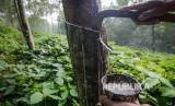 Petani menyadap karet di Cikalong Wetan, Kabupaten Bandung Barat, Jawa Barat, Senin (3/12/2018). Presiden Joko Widodo mengatakan pemerintah siap membeli karet dari petani untuk digunakan sebagai bahan baku campuran aspal dalam proyek infrastruktur. (FOTO : Raisan Al Farisi/Antara)