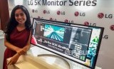 Model memperlihatkan Monitor 5K LG 34 inchi seri 34WK95U pada acara peluncurannya di Jakarta, Selasa (4/12). (FOTO : darmawan / Republika)