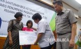 Direktur Pelayanan BPJS Ketenagakerjaan, Krishna Syari (kanan) menyaksikan Dirut PT Timah Tbk Mochtar Riza Pahlevi Tabrani menyerahkan mockup kepada ahli waris mendiang korban Lion Air JT610 Cosa Rianda Shahab di Pangkalpinang, Selasa (4/12). (FOTO : Yogi Ardhi/Republika)