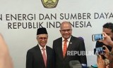 Kepala Satuan Kerja Khusus Pelaksana Kegiatan Usaha Hulu Minyak dan Gas Bumi (SKK Migas) yang baru, Dwi Soetjipto (kiri) dan mantan Kepala SKK Migas yang lama Amien Sunaryadi memberikan pernyataan kepada media usai dilantik di Gedung Kementerian Energi dan Sumber Daya Mineral (ESDM), Senin (3/12). (FOTO : Republika/Rahayu Subekti)