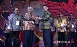 Direktur Transformasi Bisnis PT Pupuk Indonesia (Persero) Nugroho Christijanto (tengah depan) menerima penghargaan Platinum dalam Asia Sustainability Reporting (ASR) Rating 2018 dari Asisten II Setprov Lampung Taufik Hidayat (kiri depan) di Bandar Lampung, Lampung, Sabtu (8/12) (FOTO : Ardiansyah/Antara)