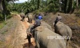 REPUBLIKA.CO.ID, ACEH -- Gajah jinak PLG Saree yang ditunggangi pawang (mahout) menggiring seekor gajah liar (dua dari depan) saat dipindahkan ke habitatnya (translokasi) di Kota Subulussalam, Aceh, Ahad (9/12).