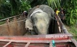 Petugas Balai Konservasi Sumber Daya Alam (BKSDA) Aceh dan pawang gajah (Mahout) dibantu gajah jinak PLG Saree menaikkan seekor gajah liar ke atas truk untuk dipindahkan ke habitatnya (translokasi) di Kota Subulussalam, Aceh, Ahad (9/12/2018). (FOTO : Antara/Irwansyah Putra)