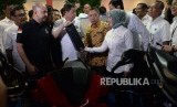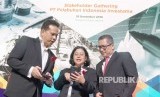 Menteri ESDM Ignasius Jonan bersama Dirut Pertamina Nicke Widyawati berbincang saat meresmikan Green Energy Station (GES) di SPBU COCO Pertamina, Kuningan, Jakarta, Senin (10/12). (FOTO : Republika/Prayogi)