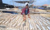 Warga menjemur ikan di Desa Branta Pesisir, Pamekasan, Jawa Timur, Senin (10/12/2018). Ikan kering yang diharga Rp.30.000 hingga Rp.100.000 per kg itu dipasarkan ke sejumlah daerah di Jatim, Jateng, dan Jogjakarta guna memenuhi kebutuhan ikan selama musim angin dan ombak. (FOTO : Saiful Bahri/Antara)