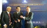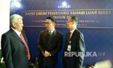 Gubernur Jawa Barat Ridwan Kamil (tengah), Dirut Bank BJB Ahmad Irfan (kanan) dan Komisaris Utama Independen Bank BJB Klemi Subiyantoro berbincang sebelum Rapat Umum Pemegang Saham Luar Biasa Tahunan 2018 di Hotel Aryaduta, Kota Bandung, Selasa (11/12). (FOTO : Republika/Edi Yusuf)